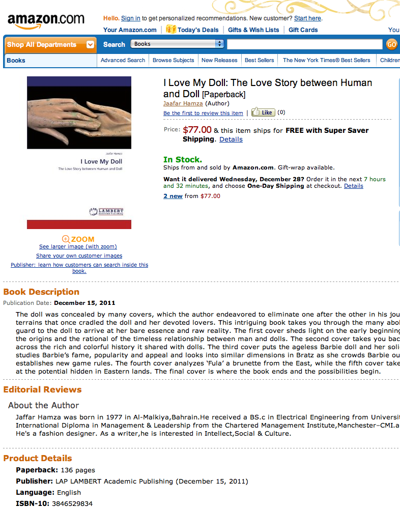 دميتي تتحدث لغات العالمبعد نطقها بالعربية، “أنا أحب دميتي” تتحدث الإنكلنيزية وتتواجد في شبكة أمازون العالميةتبنّت دار نشر ألمانية LAP LAMBERT Academic Publishing طباعة ونشر كتاب “أنا أحب دميتي،سيرة عشق الإنسان لصورته الدمية” للكاتب البحريني جعفر حمزة.ويتناول الكتاب في لغة جديدة وأسلوب مختلف العلاقة القائمة بين الإنسان والدمية تصنيعاً وهوية وتجارة وتأثراً، وذلك عبر خمسة أغلفة-كما سمّاها الكاتب-، بدء من الخلفية الفلسفية التي يطرحها الكاتب في أصل تكوّن العلاقة بين الإنسان والدمية مروراً بمرحلة التصنيع وتشكيل الهوية واستعراضاً لأشهر دمية وصتها “باربي” والحديث عن صراع جميلات البلاستيك بين “باربي” و”براتز” وانتهاء بعرض الكاتب التجربة العربية “فلة” واستنهاض مشاريع ممكنة لتكون “البديل” المنافس لنمط الهوية الغربية في مجتمعاتنا العربية والإسلامية.ومن الجدير بالذكر أن الكتاب قد تمت طباعته ونشره باللغة العربية عبر مركز الشيخ ابراهيم للثقافة والبحوث بالمحرق في مملكة البحرين. وستكون هناك نسخة إنكلينزية بتصميم مختلف تبنّى طباعته ونشره أيضاً مركز الشيخ ابراهيم نفسه.وصلة الكتاب في موقع أمازونhttp://www.amazon.com/Love-My-Doll-Story-between/dp/3846529834/ref=sr_1_fkmr0_1?ie=UTF8&qid=1324985130&sr=8-1-fkmr0لمزيد عن الكتاب باللغة العربية، قم بالبحث في غوغل بهذه الكلمات “أنا أحب دميتي” -