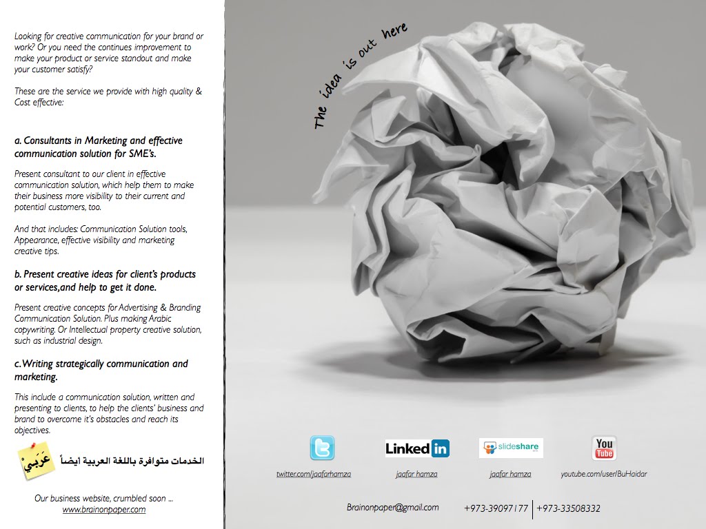 أعمل حاليا على تقديم خدمات متنوعة متعلقة بالاستشارة في التسويق الذكي، وبيع الأفكار، فضلا عن خدمات الإعلان المبتكر من خلال موقع جديد سيتم إطلاقه قريبا، ولن تقتصر خدمات هذا الموقع على البحرين أو المنطقة، بل سيشمل نشاطه الدول الأجنبية أيضا.