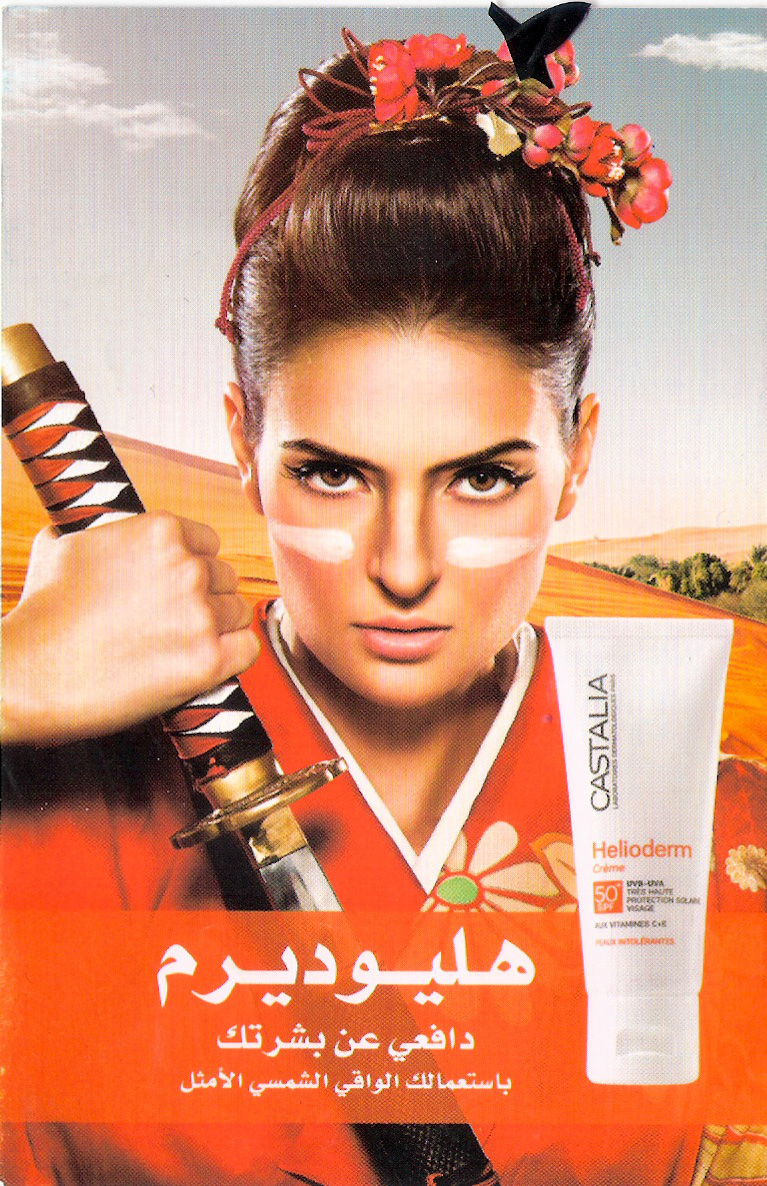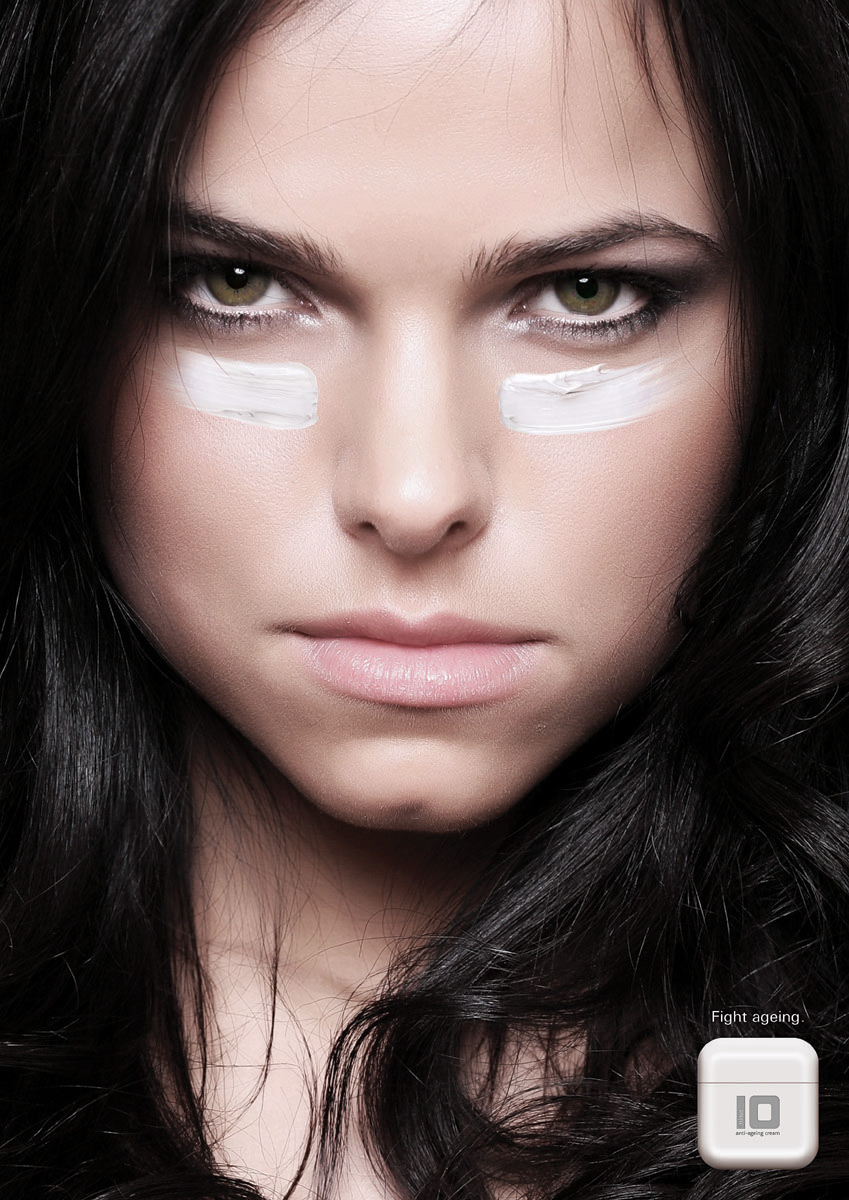 وتقدّم فكرة إعلاني عن مستحضر تجميل “كريم” ضد التجاعيد، وذلك عبر صورة امرأة في عينيها التحدي وتحتهما خطين مرسومان كالذي يضعه المحاربون القدامى لإرهاب العدو ودلالة على الإقدام والشجاعة، وما زال الأمر مستخدماً للاعبي كرة القدم الأمريكية، وكذلك لفرق الكوماندوز أيضاً، والفكرة هنا هو في استخدام مستحضر التجميل في رسم هذين الخطين، مع عنوان “حارب تقادم العمر